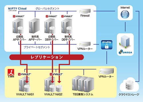 TBSでは長年にわたり、番組宣伝コンテンツの配信を複数のシステムを組み合わせて運用してきた。しかし、増え続けるコンテンツやシステム老朽化が原因でシステムのパフォーマンスが落ち、業務効率の悪化や大量のコンテンツのバックアップにも多大なコストがかかるといった課題を抱えていた。そこで、複数のテレビ局で導入実績があり、ニフクラ(旧:ニフティクラウド)を基盤とすることで安定運用を続けていたオレガの「番宣組」を導入をし、ストレージ仮想化ソフトウェア「VVAULT」を適用したバックアップの仕組みを構築・導入した。