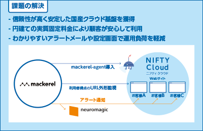 このようにニフクラ(旧:ニフティクラウド)を顧客サイトの運用に活用してきたニューロマジックは、2015年12月から新たにサーバー監視サービスを導入した。ニフクラ(旧:ニフティクラウド)にも基本監視・パフォーマンスチャートの機能はあるが、アラートメールの情報量の多さから、知識がないお客様が対応することは難しい。それにより、アラートが出るたびに問い合わせが増え、ニューロマジックに業務負担がかかっていた。その課題を解決するために導入されたのが、ニフクラソリューションパートナーのはてなが提供するサーバー監視サービスMackerelだった。