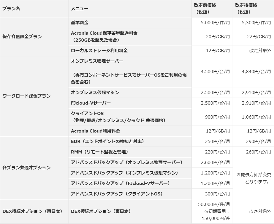 FJcloud-V(旧ニフクラ)「バックアップ/セキュリティサービス(Acronis Cyber Protect Cloud)」一部サービスメニューの価格改定および一部オプションメニュー提供方式変更について