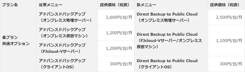 「パブリッククラウドへのバックアップ機能」については、以下の通り新しいオプションメニューとして提供を開始します。